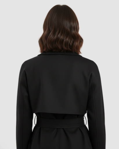 This piece embodies contemporary elegance by revisiting the classic trench coat style in a short, structured version. Its sophisticated silhouette is defined by generous lapels and a double-breasted closure that adds a touch of architectural rigor to the overall design.