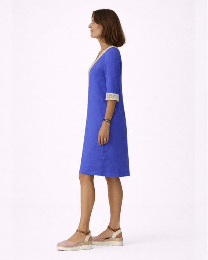 This women’s dress in a straight cut stands out for its effortless elegance and refined summer vibe. Featuring a deep V-neckline highlighted by a wide contrasting embroidered trim, it adds a bright, handcrafted touch to the silhouette.